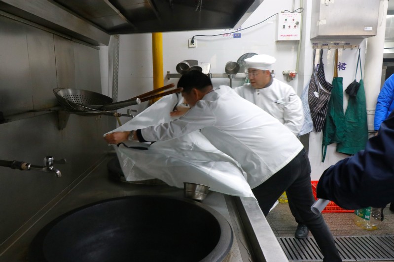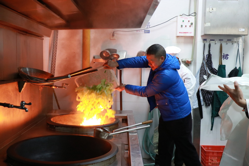 随后,饮服中心主任季楼平强调了此次演练的重要性,并宣布演练开始,现场进入实战演练环节。在食堂主任陈俊的指挥下,演练模拟了炒菜过程中油温过高导致油锅起火的险情。面对燃起的火苗,操作人员迅速响应,首先按照预案将准备好的蔬菜沿锅边倒入,利用蔬菜与热油的温差有效压制了火势。紧接着,模拟较大火势下使用灭火毯的过程,工作人员迅速取来灭火毯,规范地覆盖在油锅上,彻底隔绝空气,将残余明火完全熄灭。整个处置过程连贯、迅速,展现了员工对多种灭火方法的熟练掌握和协同配合能力。