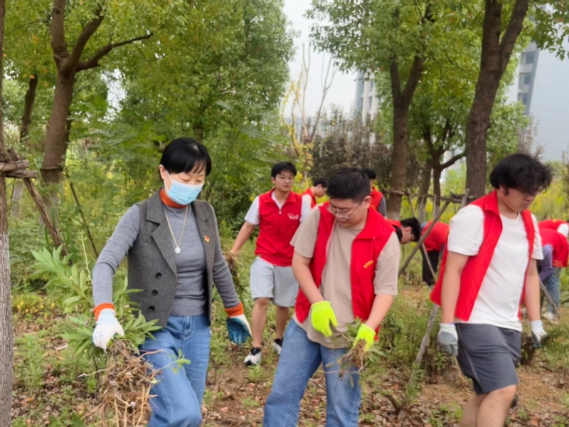 在劳动环节,师生分工协作:有的手持镰刀清理一枝黄花,有的弯腰拔除顽固根茎,还有的将清理出的一枝黄花集中堆放。从教室到田间,从理论到实践,同学们深刻体会到‘一粥一饭当思来之不易’的含义,更感受到劳动中团结协作的力量。