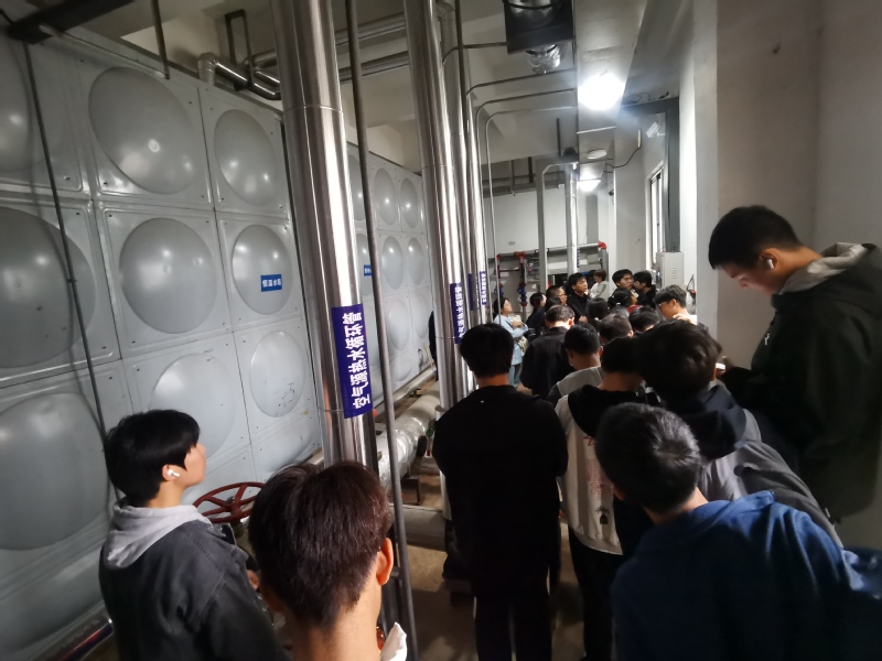 接着,同学们又探秘热水泵房,感受从“冷水”到“暖流”的旅程。大家了解到宿舍的热水是通过热水泵房空气源热泵加热、储水罐恒温储存、循环泵输送至栋楼热水管网,最终到达每一个房间的流程。同学们感慨:“原来热水不是烧开就送来,背后有这么多设备在默默工作!之前总担心冬天热水不够,现在看到储水罐这么大,还有自动控温,心里踏实多了!”