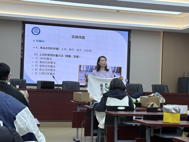 活动启动大会上专业收纳师围绕空间利用最大化、分类可视化核心原则,拆解“断舍离”“区域规划”实用方法,手把手教大家选对收纳工具、破解宿舍杂乱痛点。会议室模拟宿舍场景,同学们现场实操衣物折叠与收纳技巧,收纳师巡回指导,手把手纠正细节;样板观摩:同学们集体前往样板间,学习空间规划、物品摆放逻辑,直观感受收纳前后的蜕变,大家纷纷表示收获满满。