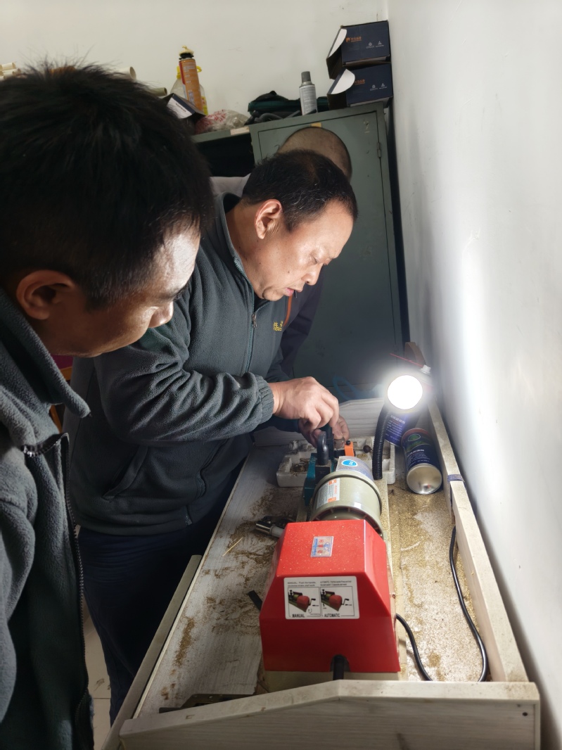 维修中心制作间,综合工杨荣平指导新员工操作钥匙机,传授锁具应急拆除与更换技术要点。
